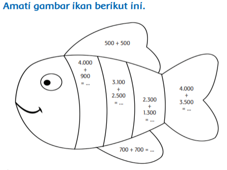 Warnai dengan warna merah bagian tubuh ikan untuk hasil penjumlahan lebih dari 5.000. Warnai dengan warna kuning bagian tubuh ikan untuk hasil penjumlahan kurang dari 5.000. Warnai dengan warna biru untuk hasil penjumlahan sama dengan 1.000.